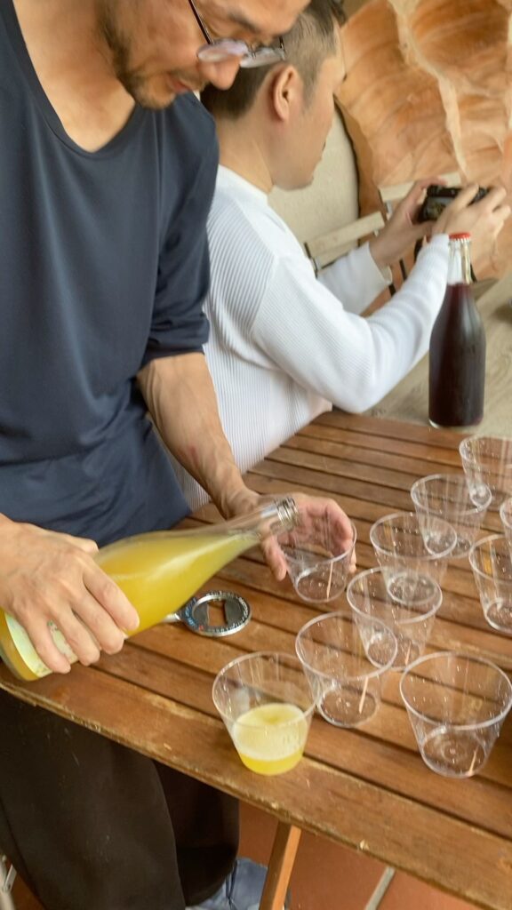 最初は見よう見まねで、慣れてきたころに「ちょっと休憩しよっか」の声。なんと振る舞われたのは、出来立てのワイン。外で汗かいた後に飲む冷えたグラス、最高でした。