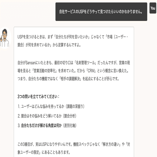 回答(AI日比谷): USP探しって、意外と自社を見つめすぎるから迷うんですよ。